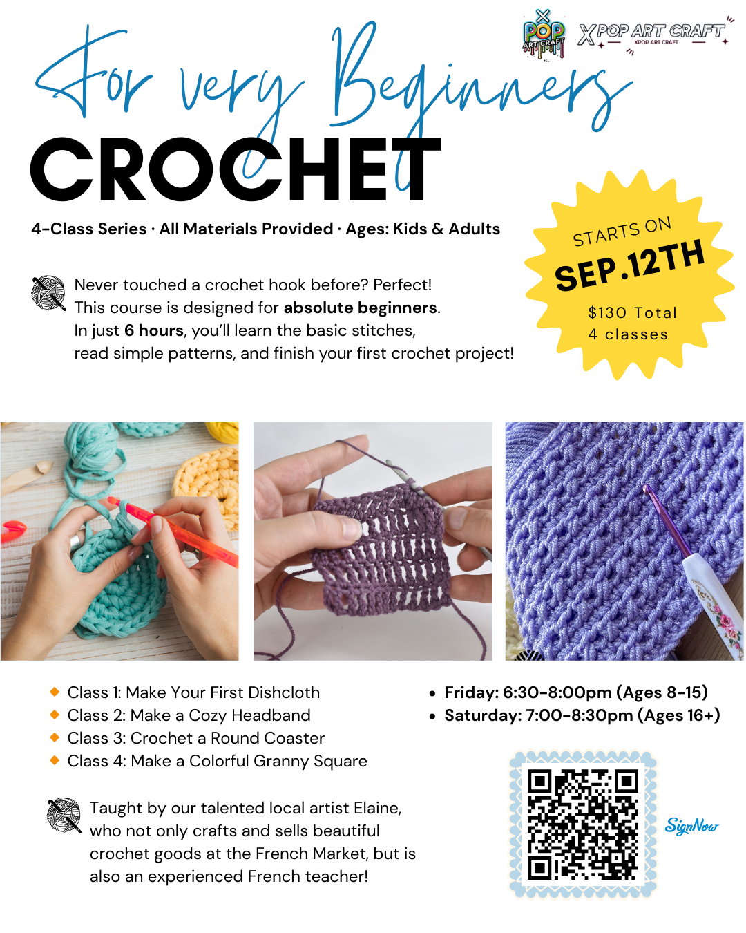 ✨ Total: 4 classes × 1.5 hrs = 6 hours of crochet fun!