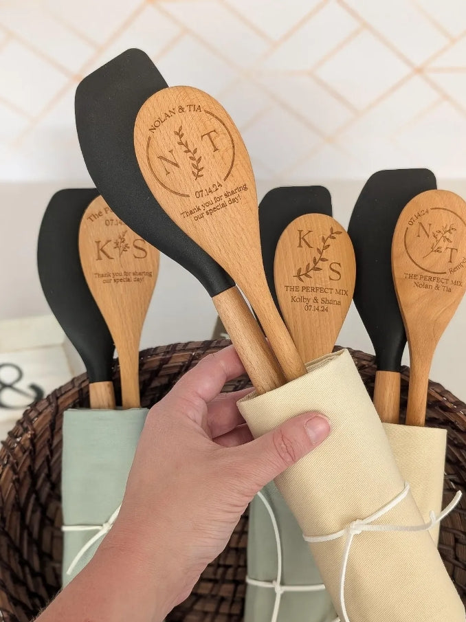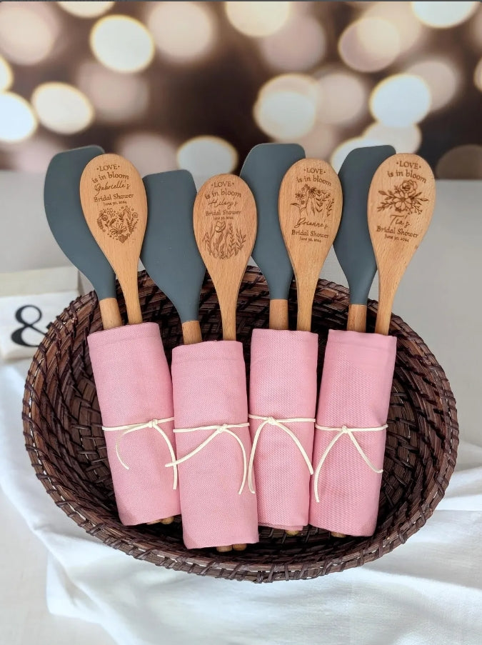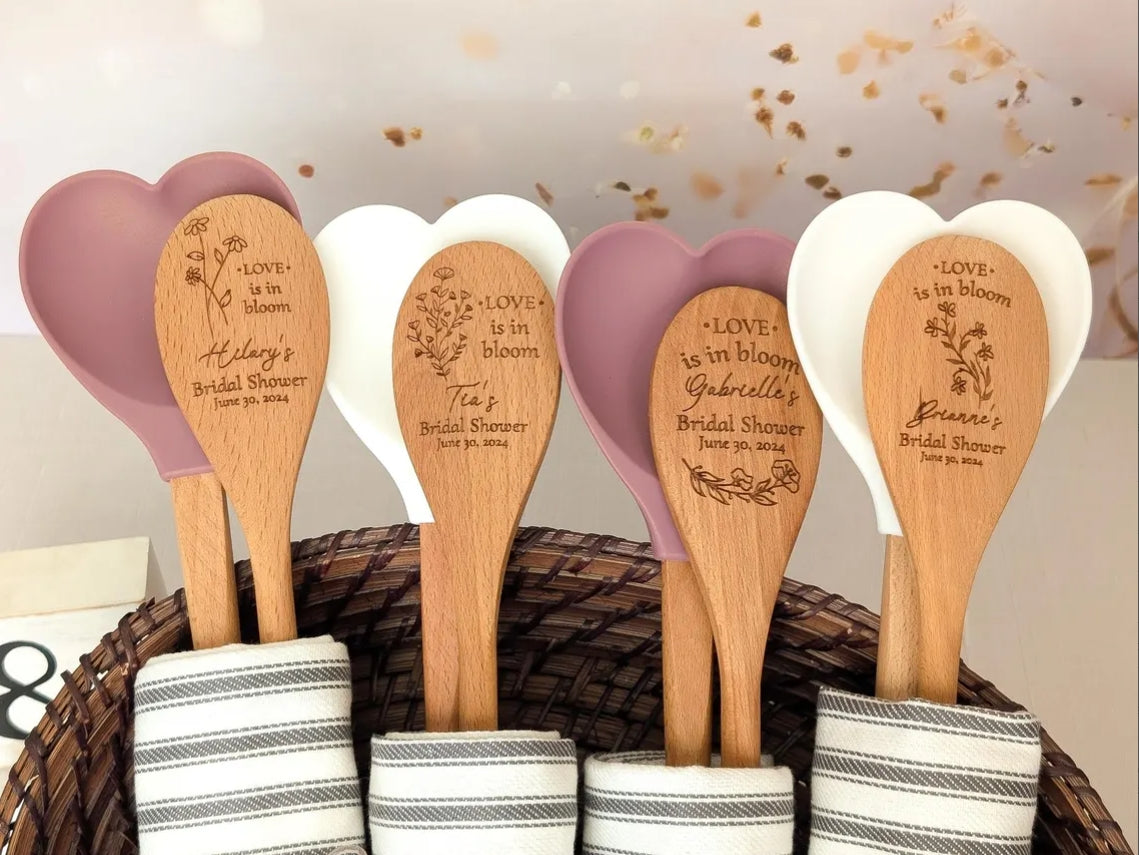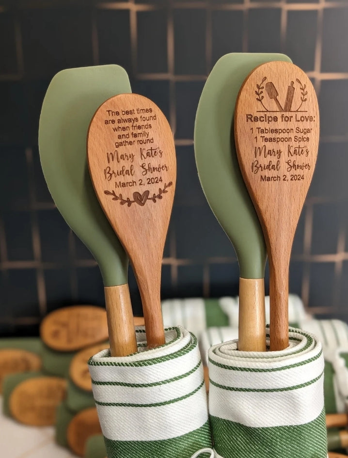 Personalized wooden spoons and/or spatula engraved with either one of our options or with your text, ideas, etc! Whether for a bridal shower, wedding, baby shower, birthday party, tea party, etc these rustic kitchen spoons will be a unique and useful favor your guests will actually use! We always send proof/s after purchase before engraving to ensure it is just right for you!